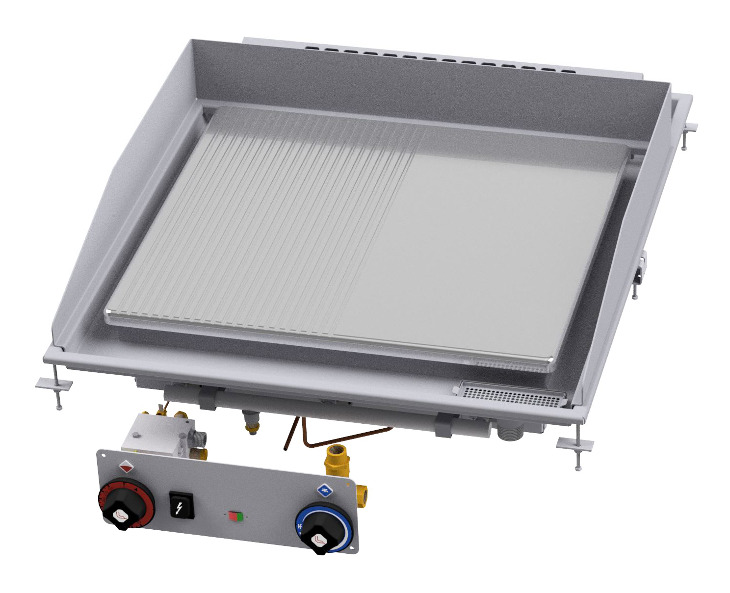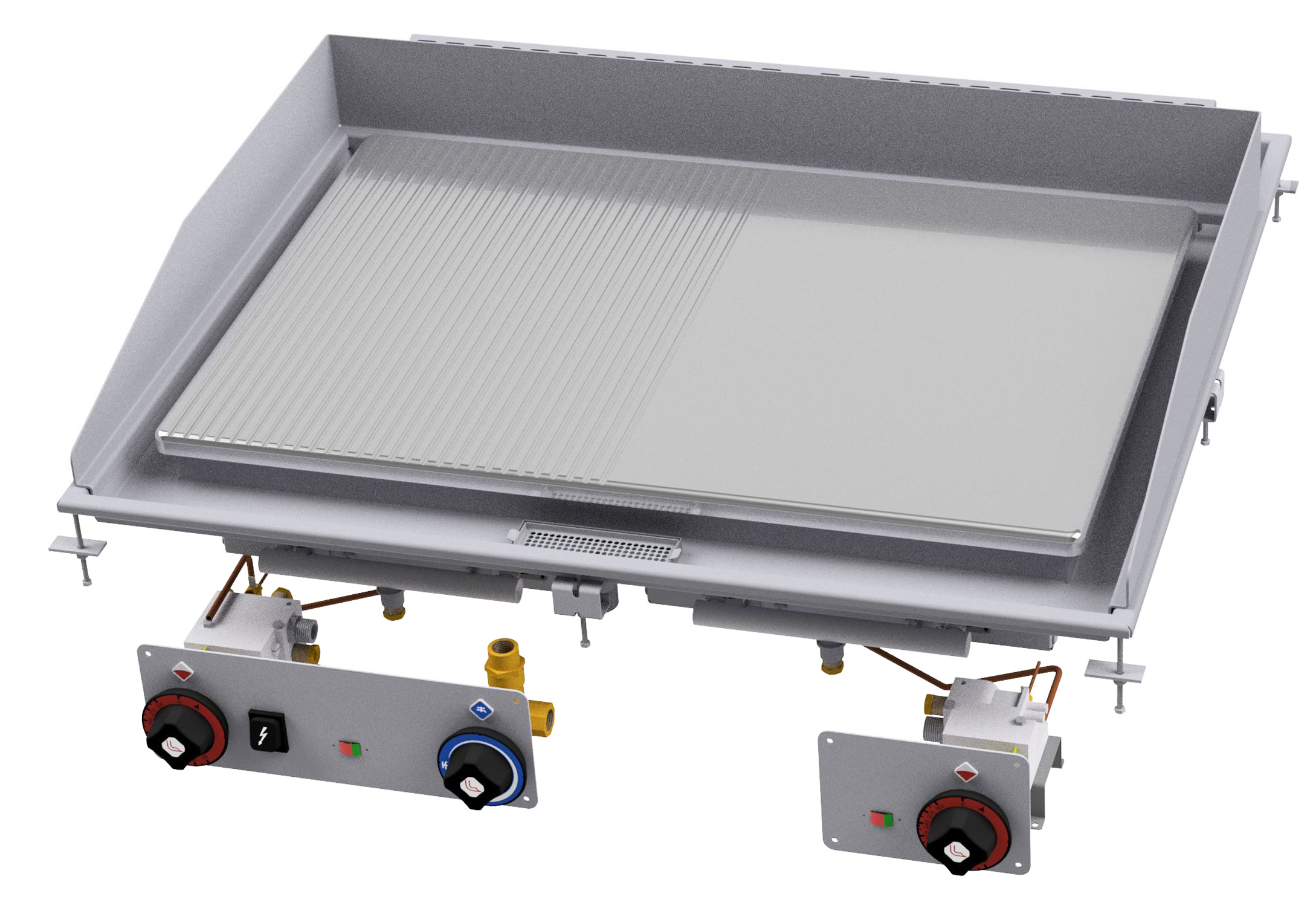 Fry-top gas 1/2 rigato + 1/2 liscio cromato SUPERCHROME (Moca Approved), piastra cm.79×68,5 – 2 zone di cottura. Accensione elettrica, indicatore presenza fiamma pilota, canala perimetrale allagabile, scarico con filtro removibile.