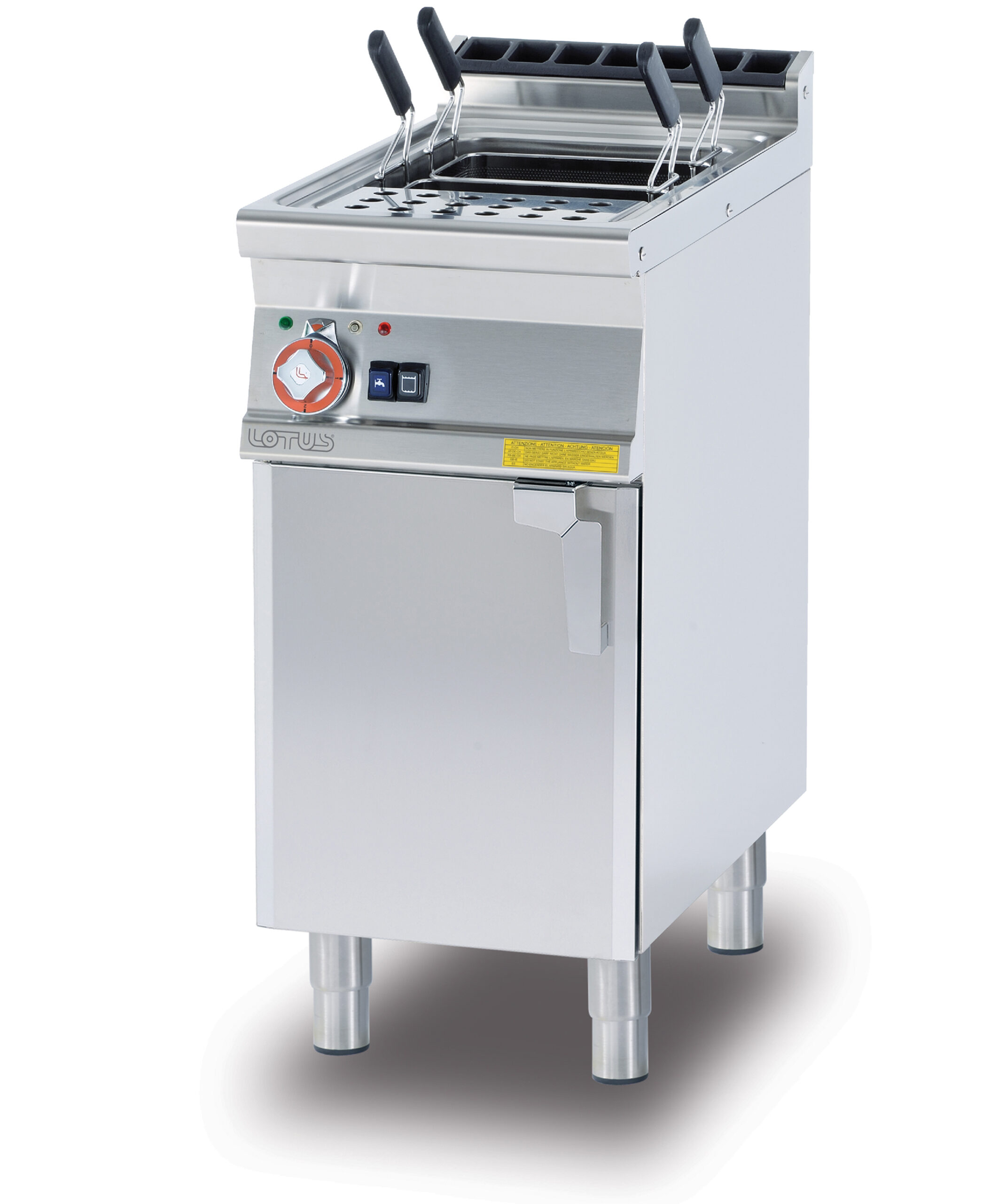 CUOCIPASTA TRIFASE LT. 40 Vasca cm. 30,7×50,9×32,7h. Carico acqua automatico con sensore di livello – sfioratore + scarico a pavimento (CESTI ESCLUSI)