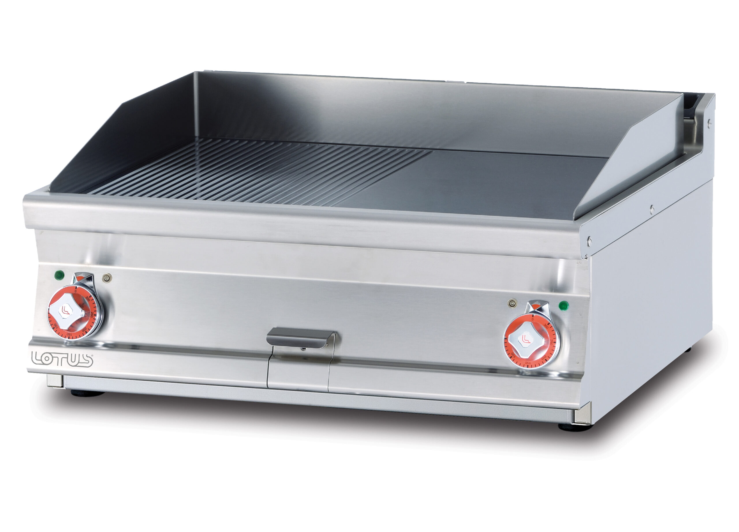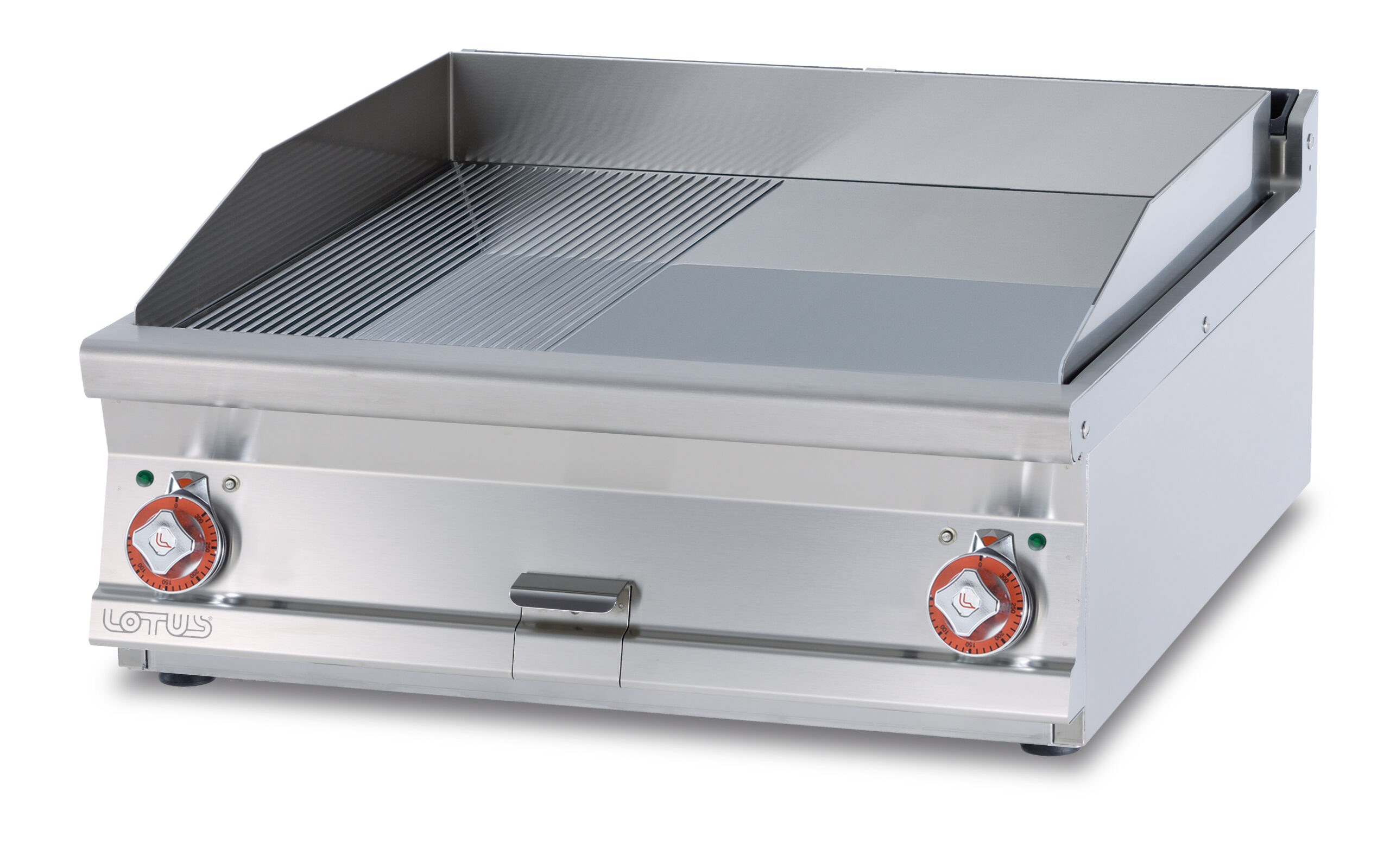 Fry-top elettrico 1/2 rigato + 1/2 liscio cromato SUPERCHROME (Moca Approved), piastra cm.76×68 – 2 zone di cottura (inclusa 1 testata chiusura piano mod.TPA-9)
