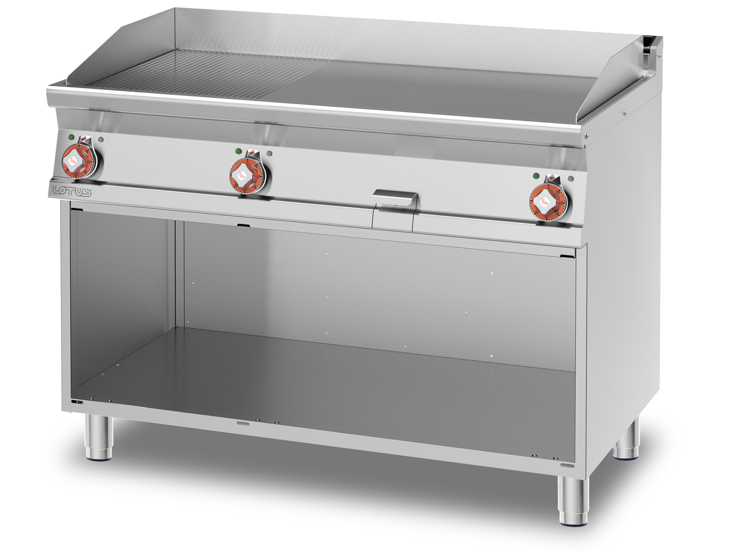 Fry-top elettrico 1/3 rigato + 2/3 liscio, su mobile a giorno, piastra cm.116×51 – 3 zone di cottura (inclusa 1 testata chiusura piano mod.TPA-7)