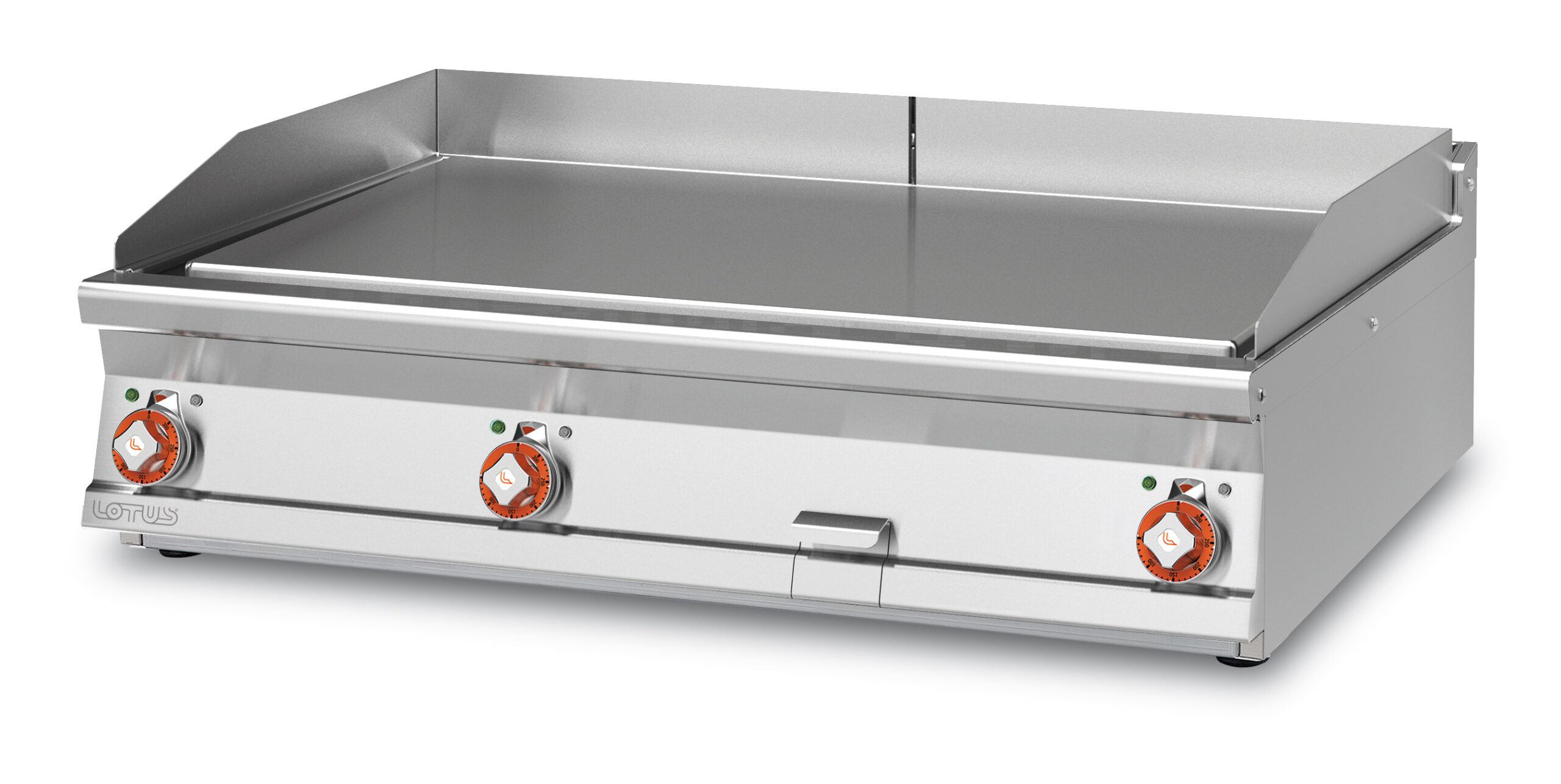 Fry-top elettrico liscio cromato SUPERCHROME (Moca Approved), piastra cm.110,5×65 – 3 zone di cottura (inclusa 1 testata chiusura piano mod.TPA-9)