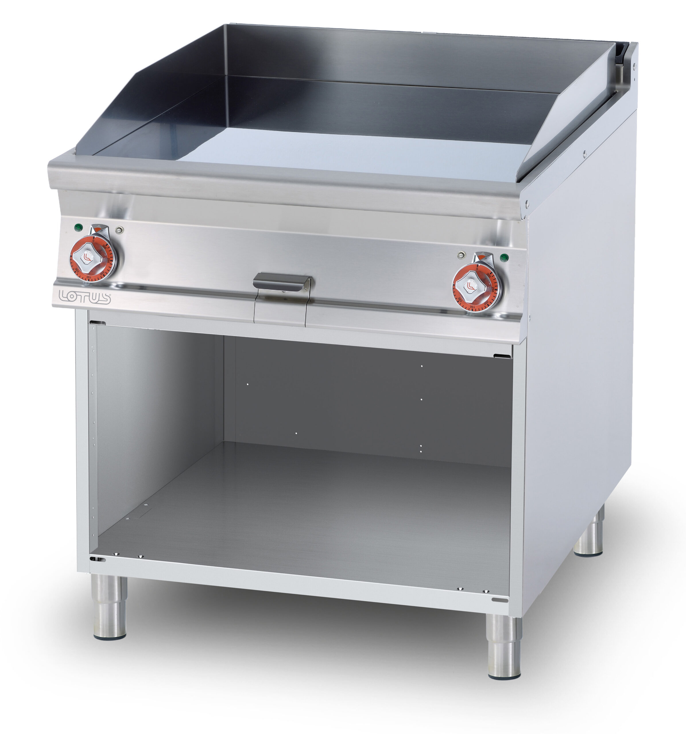 Fry-top elettrico liscio cromato SUPERCHROME (Moca Approved), su mobile a giorno, piastra cm.76×68 – 2 zone di cottura (inclusa 1 testata chiusura piano mod.TPA-9)