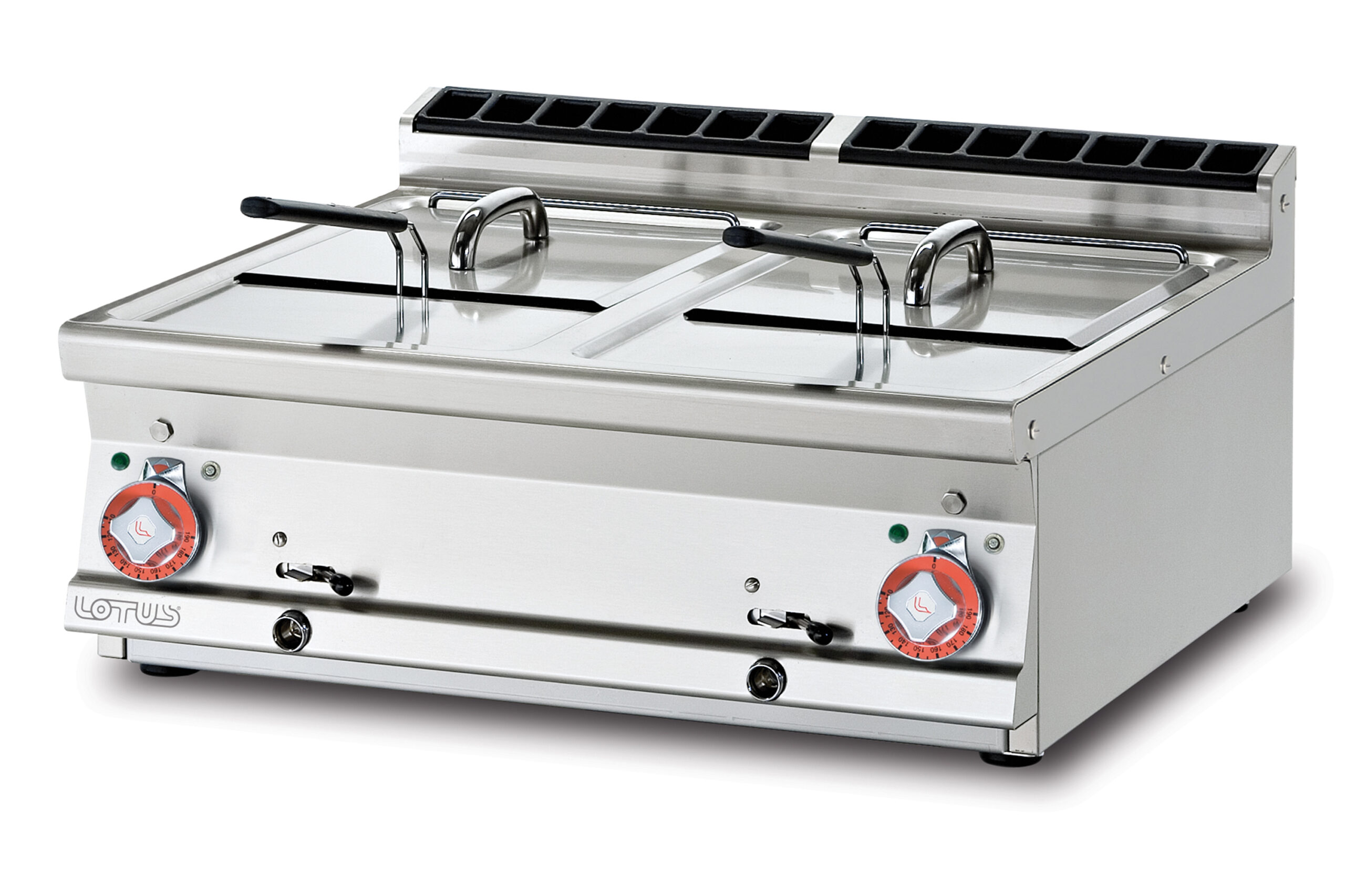 FRIGGITRICE GAS LT. 13+13 2 vasche cm. 31,5×34,5×22,5h – 2 cesti cm. 28x29x10h 2 filtri e coperchi vasche – Prod. patate: 20 kg/h (inclusa 1 testata chiusura piano mod.TPA-7)