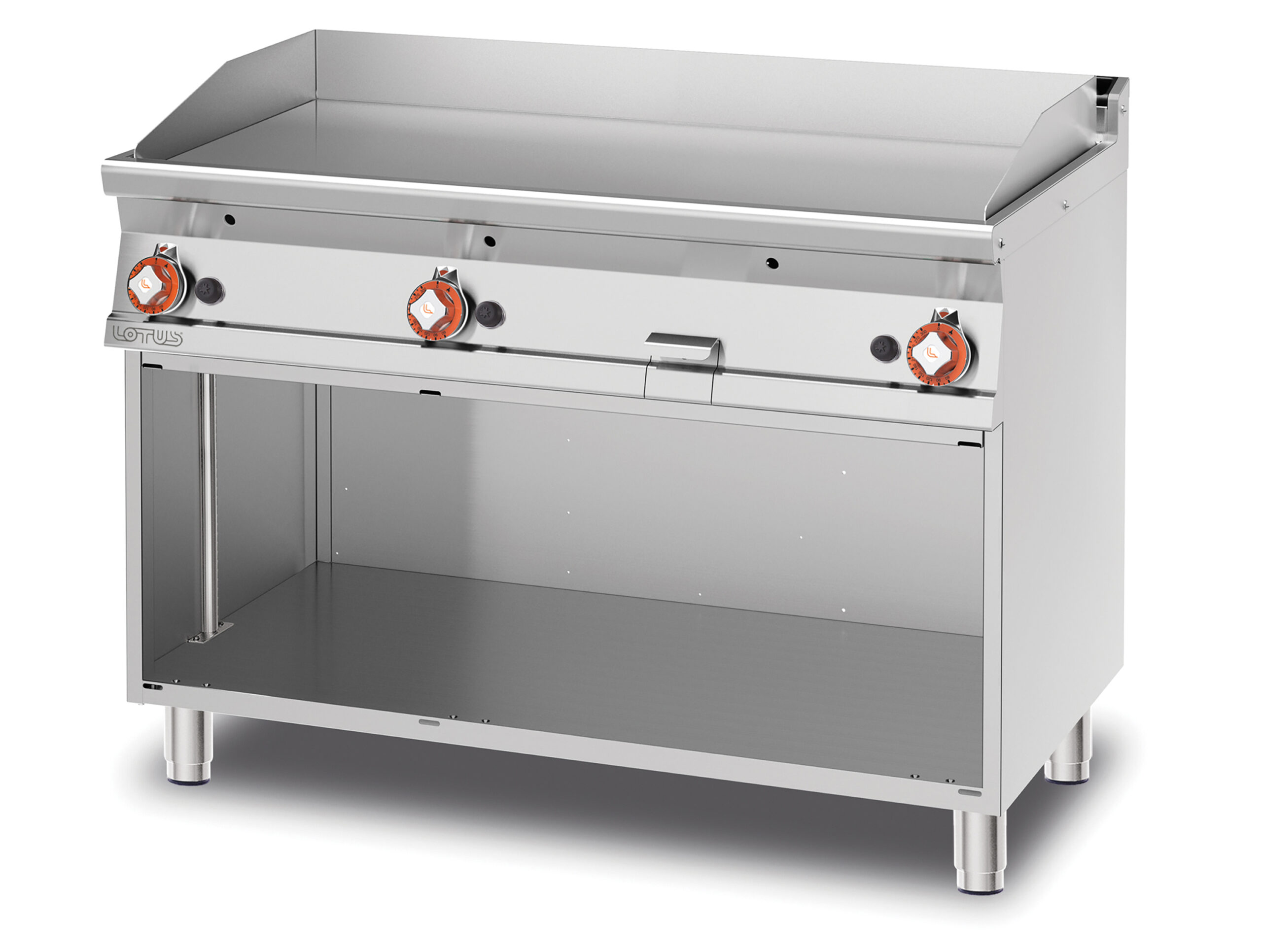 Fry-top gas liscio, su mobile a giorno, piastra cm.116×51 – 3 zone di cottura (inclusa 1 testata chiusura piano mod.TPA-7)