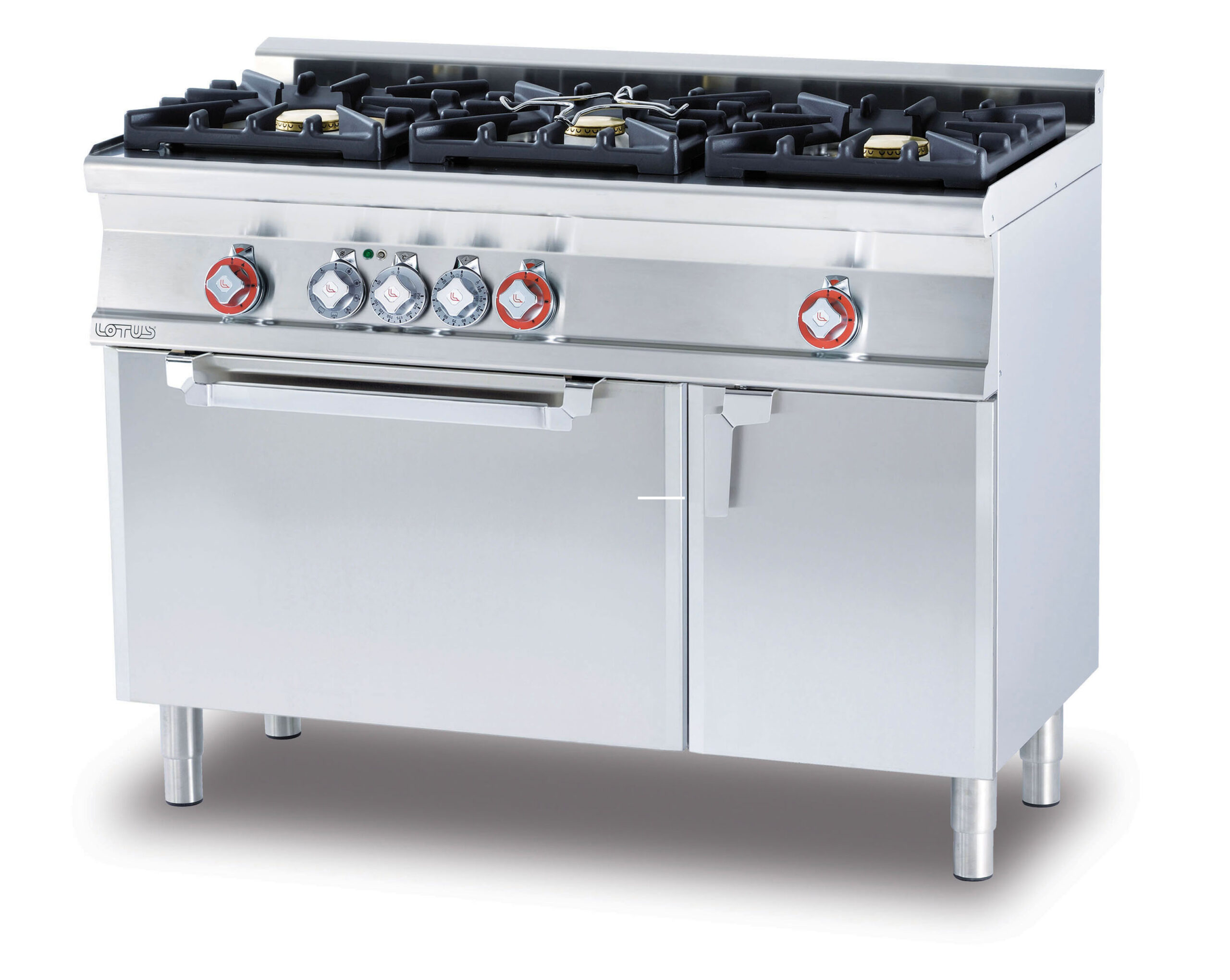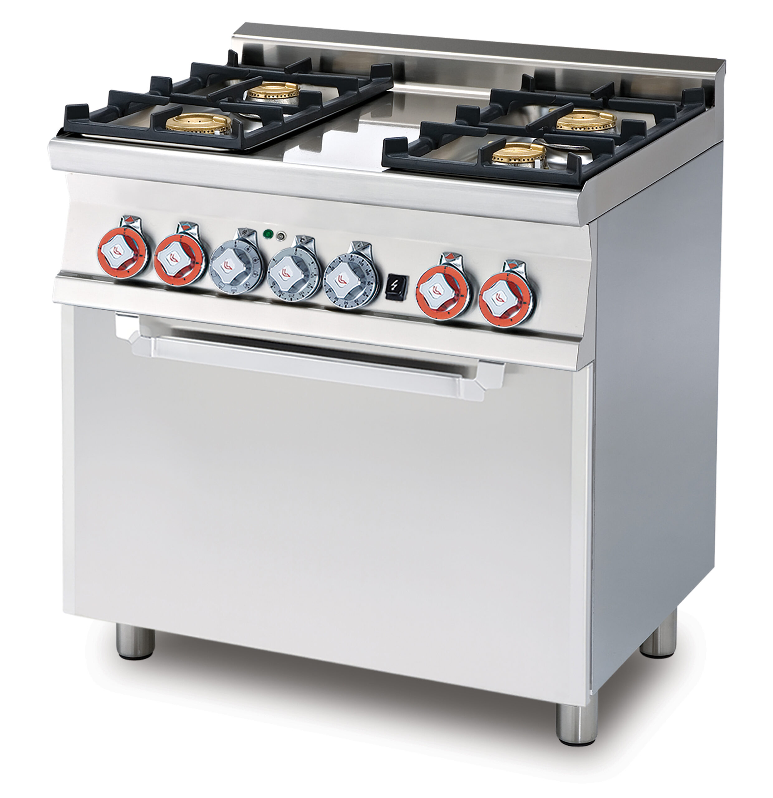 CUCINA MISTA 4 FUOCHI CON Forno elettrico multifunzione – Camera cm. 64x37x35h, temp: 50÷250°C, con 1 griglia cm.53×32,5 GN1/1 – Porta vetro