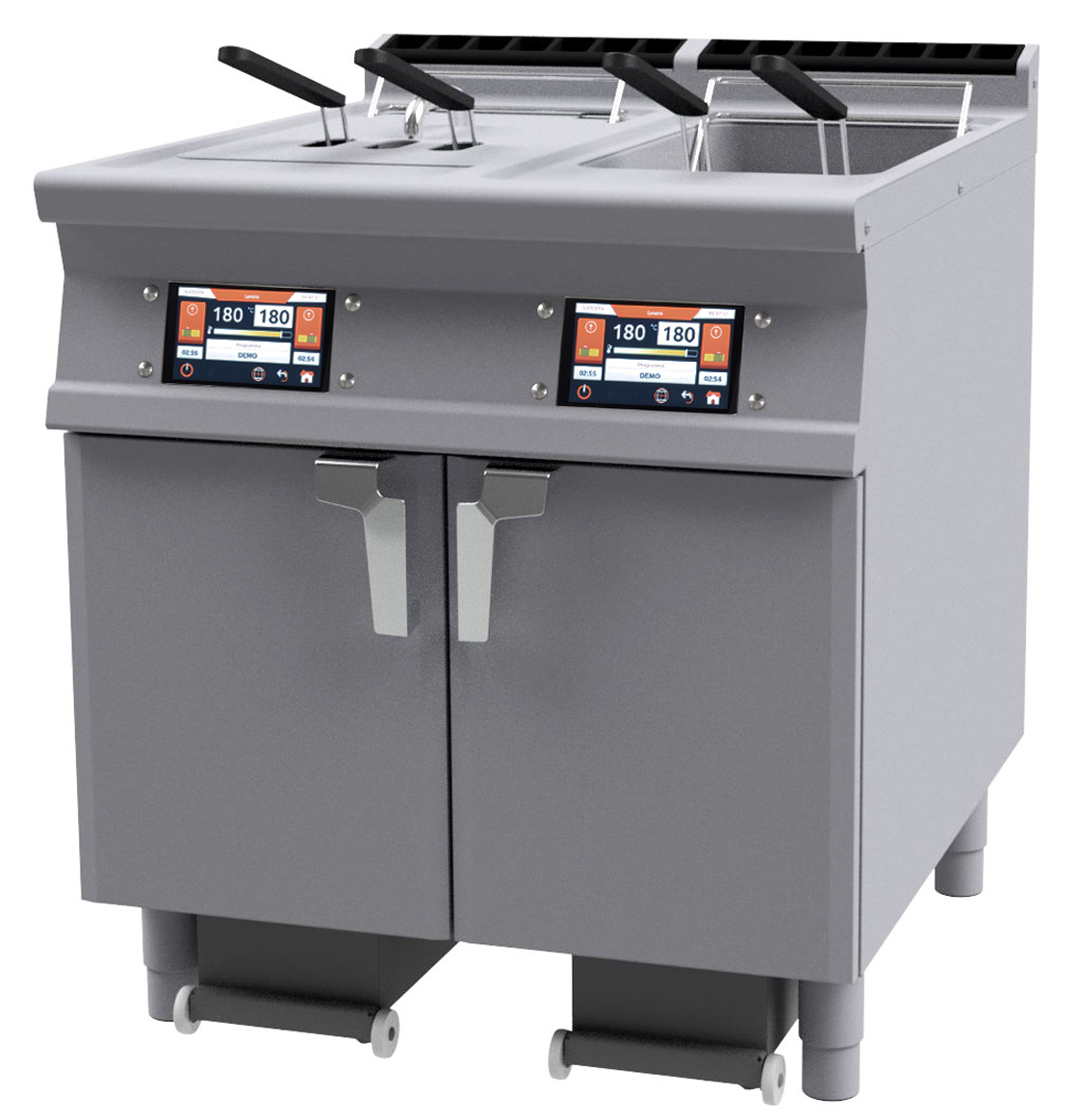 FRIGGITRICE ELETTRICA ELETTRONICA con TouchScreen 7″. Conservazione a 110 °C o Prelavoro a 160 °C con o senza Melting. Possibilità di inserire in memoria fino a 100 programmi. Sensore presenza e livello massimo olio. 2 pompe filtraggio olio a caldo max 18