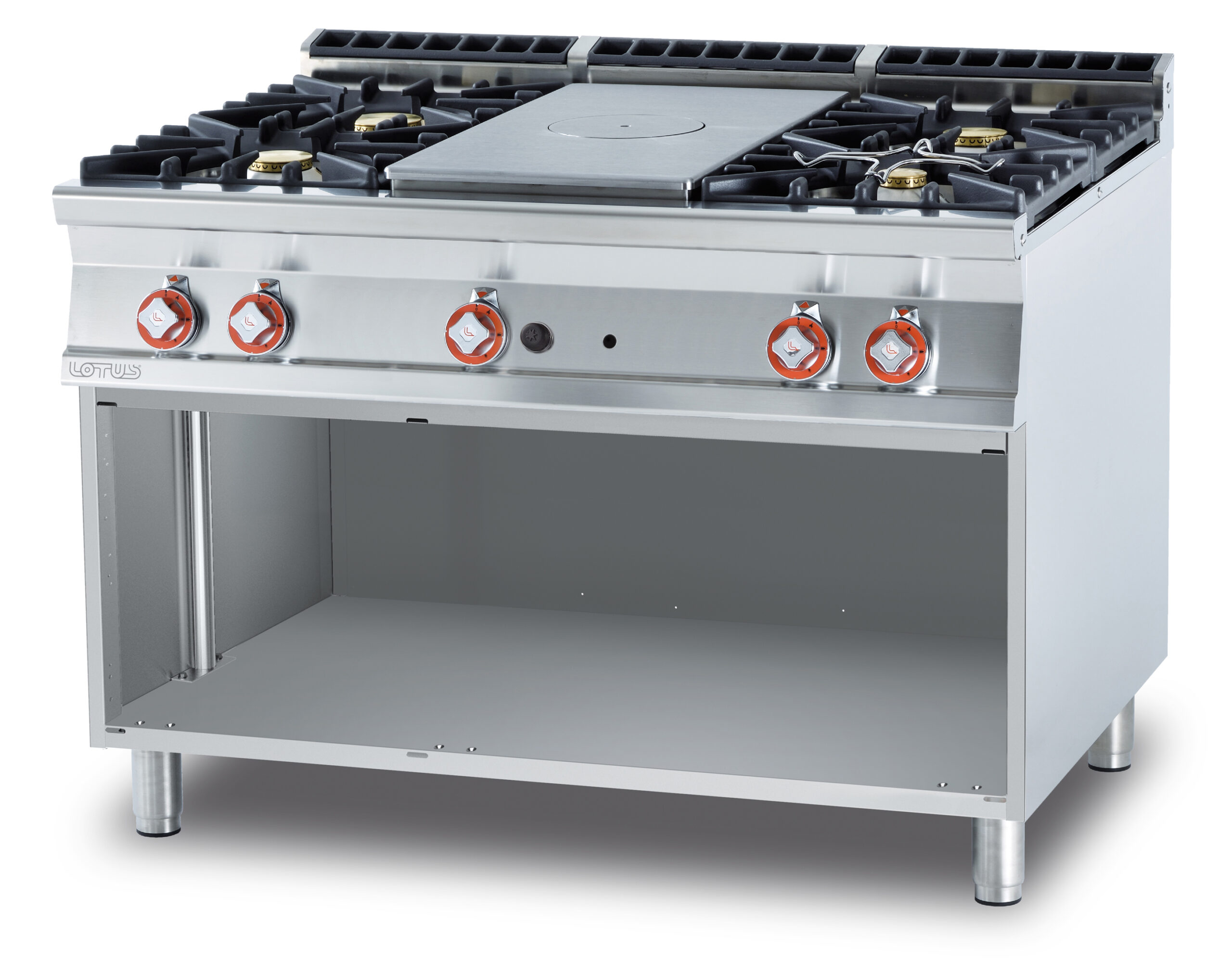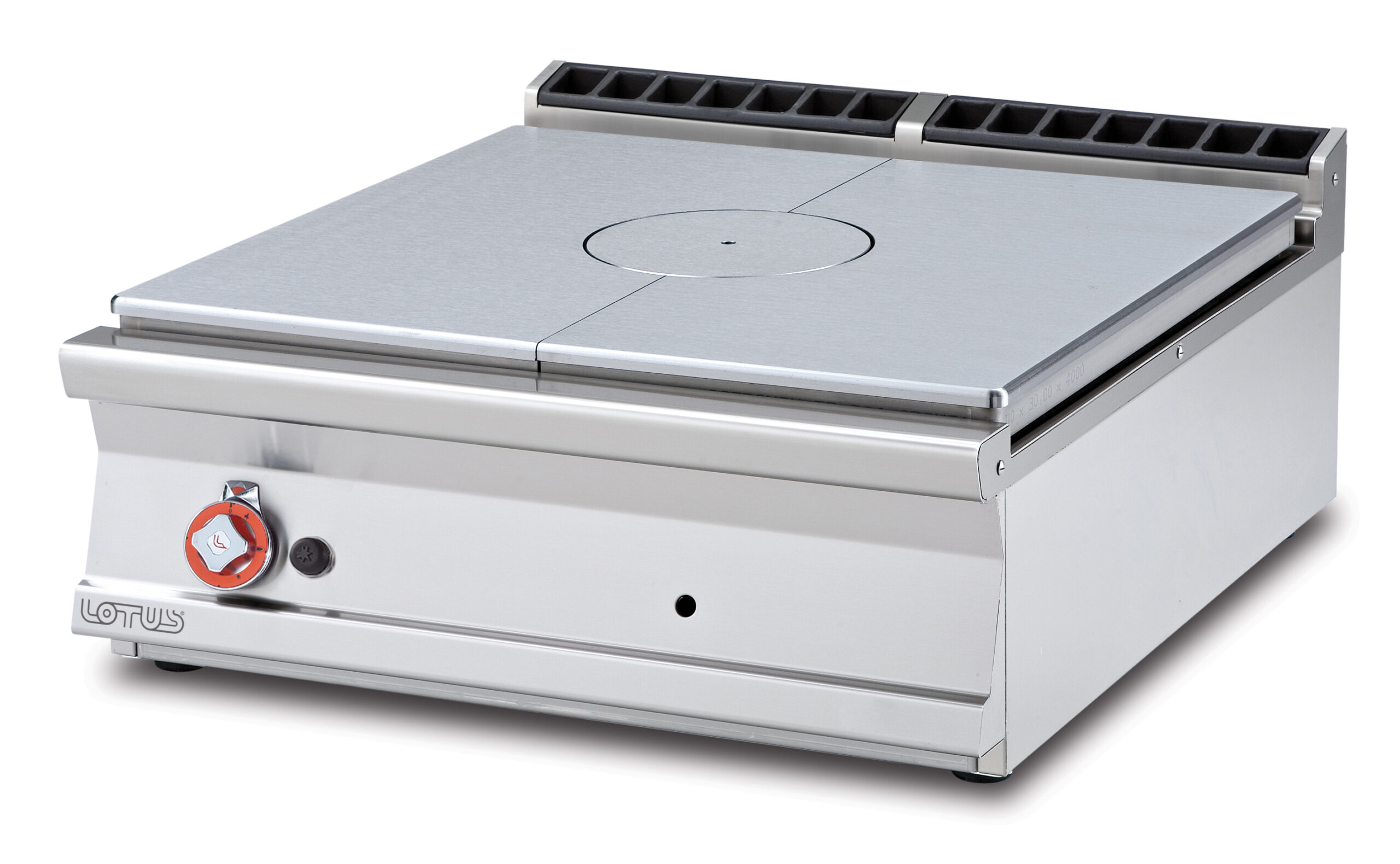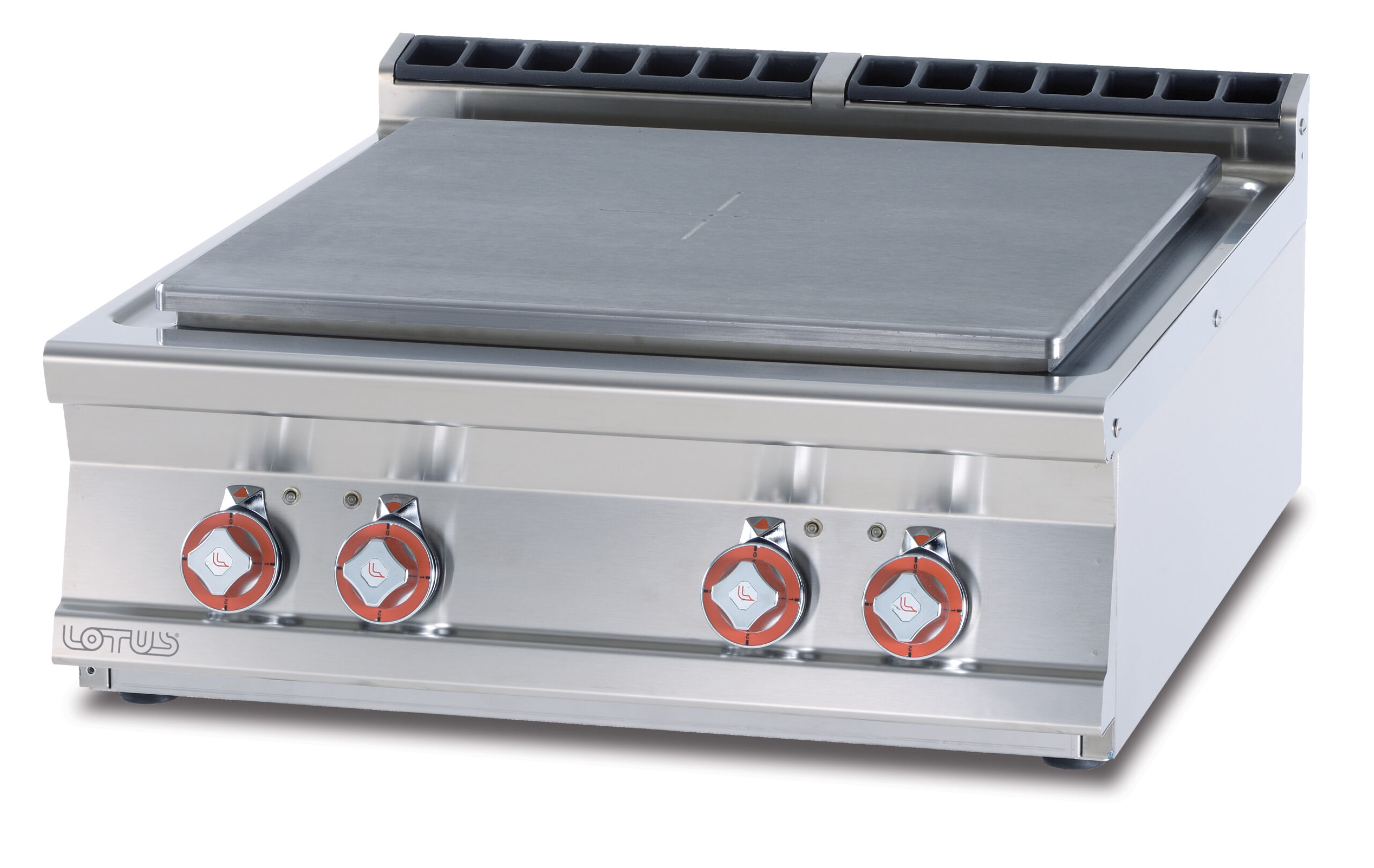 TUTTA PIASTRA + 4 FUOCHI SU Forno elettrico statico cm. 67x73x34h, temp: 50÷300°C, con 1 griglia cm.65×71 GN2/1 – Piastra cm 39×73 – vano neutro con porta (inclusa 1 testata chiusura piano mod.TPC-9)