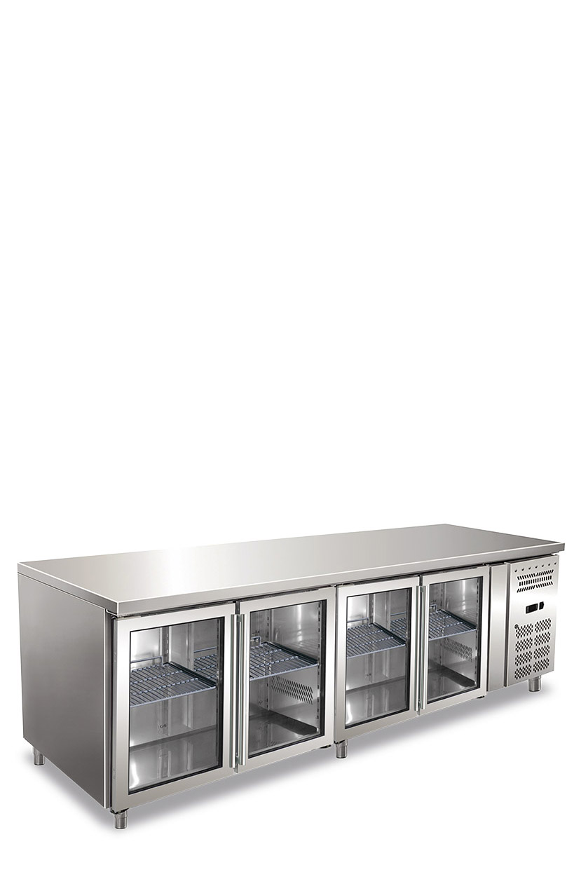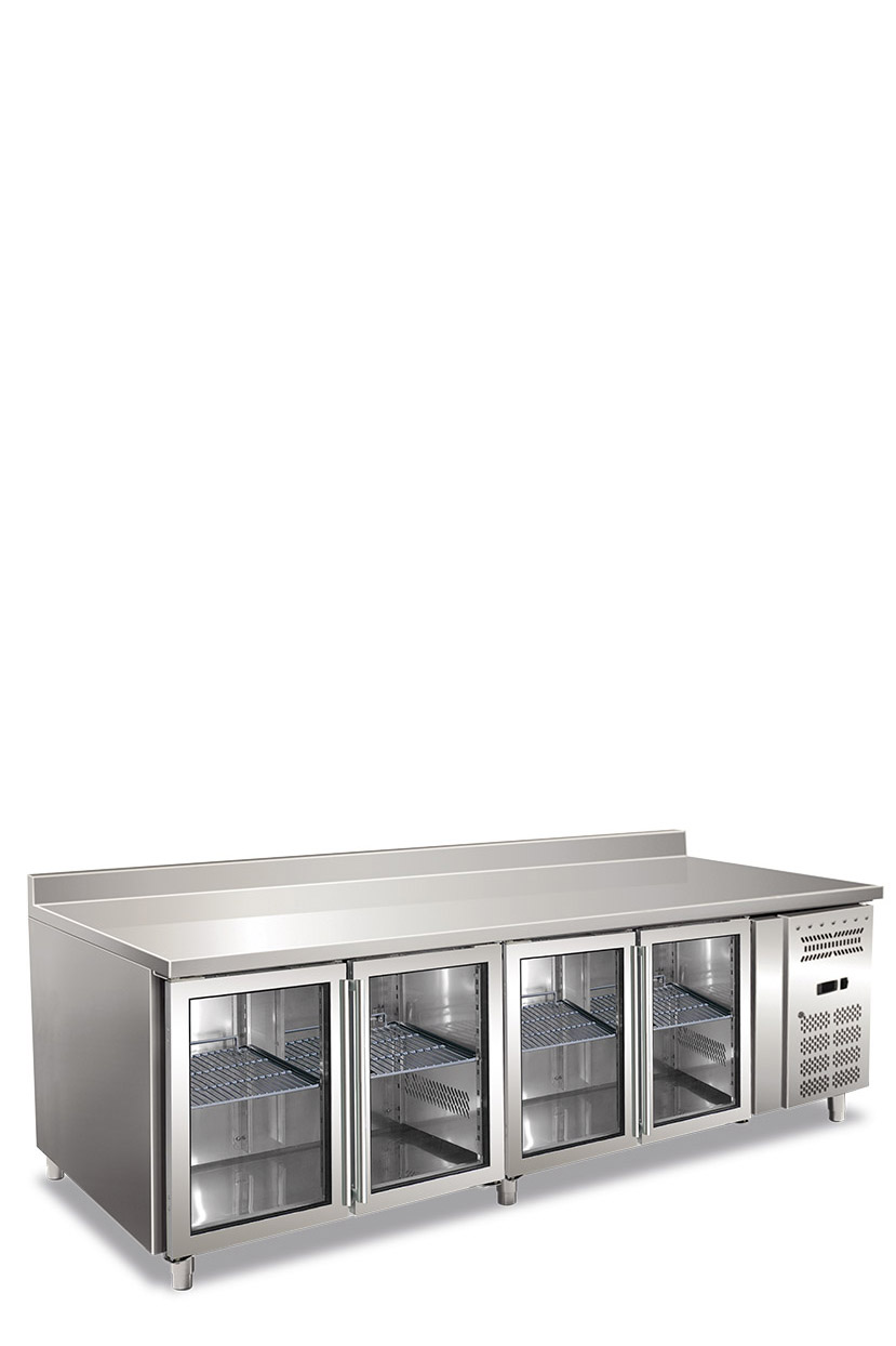 Tavolo refrigerato quattro ante, porte vetro ventilato. Temperatura normale