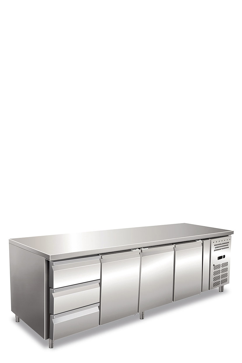 Tavolo refrigerato quattro ante ventilato. Temperatura normale. Versione con 1 Cassettiera refrigerata da N.3 Cassetti da 1/3