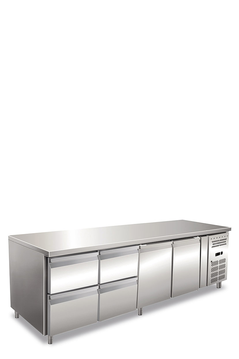 Tavolo refrigerato quattro ante ventilato. Temperatura normale. Versione con 1 Cassettiera refrigerata da N.2 Cassetti da 1/2