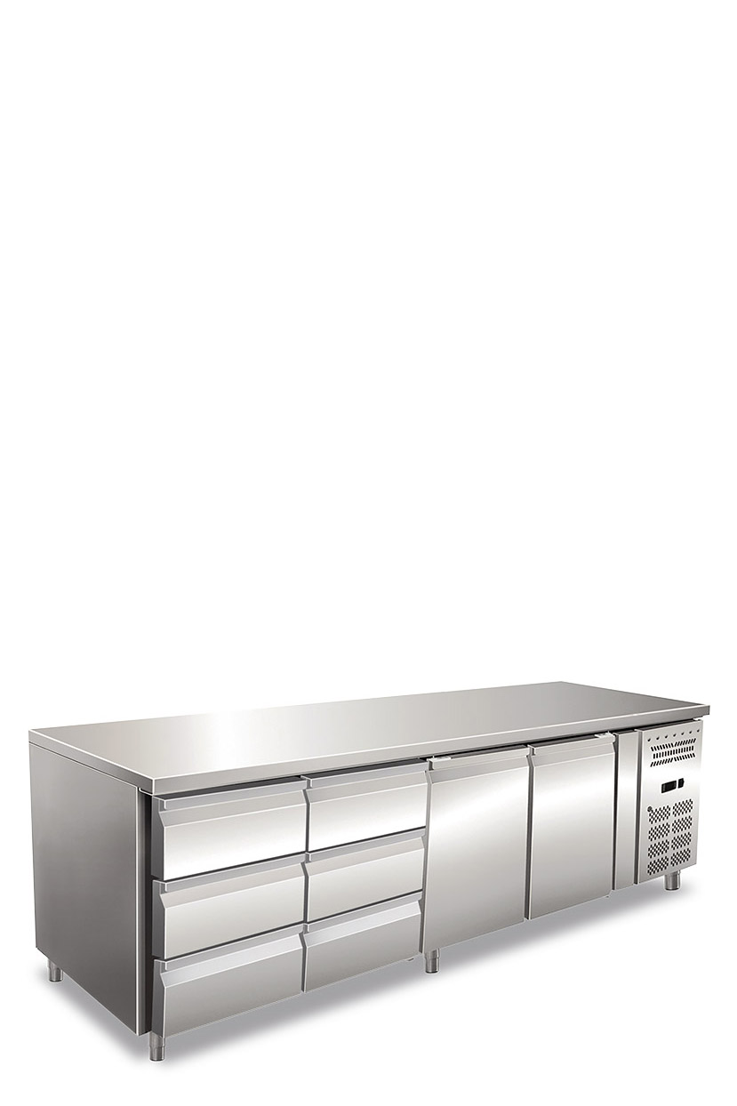 Tavolo refrigerato quattro ante ventilato. Temperatura normale. Versione con 2 Cassettiere refrigerate da N.3 Cassetti da 1/3