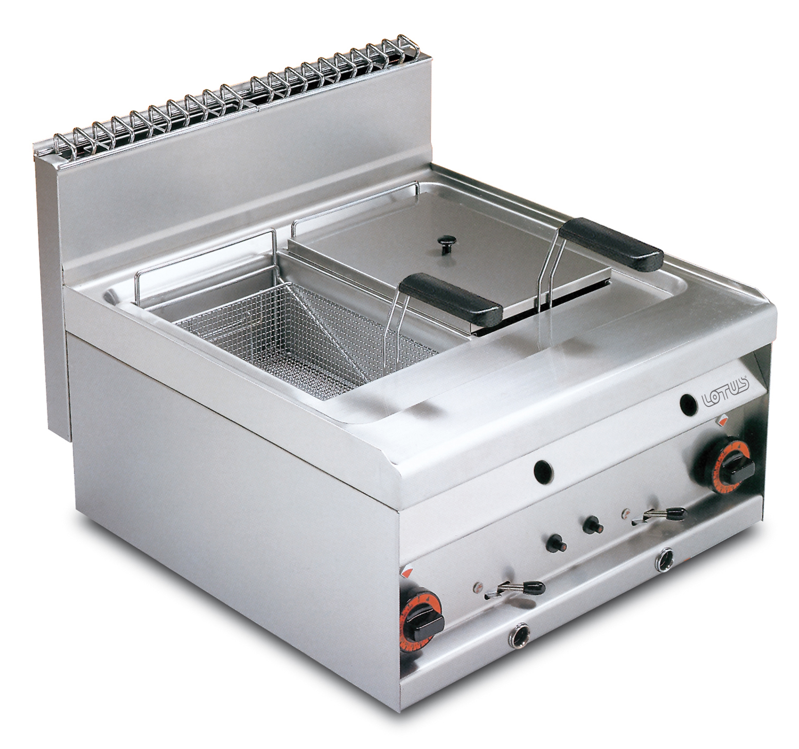 FRIGGITRICE GAS LT. 8+8 – 2 vasche cm. 15x35x23h 2 cesti cm. 12x30x9,5h. Filtro e coperchio vasca. Prod. patate: 12 kg/h (inclusa 1 testata chiusura piano mod.TPA-9)